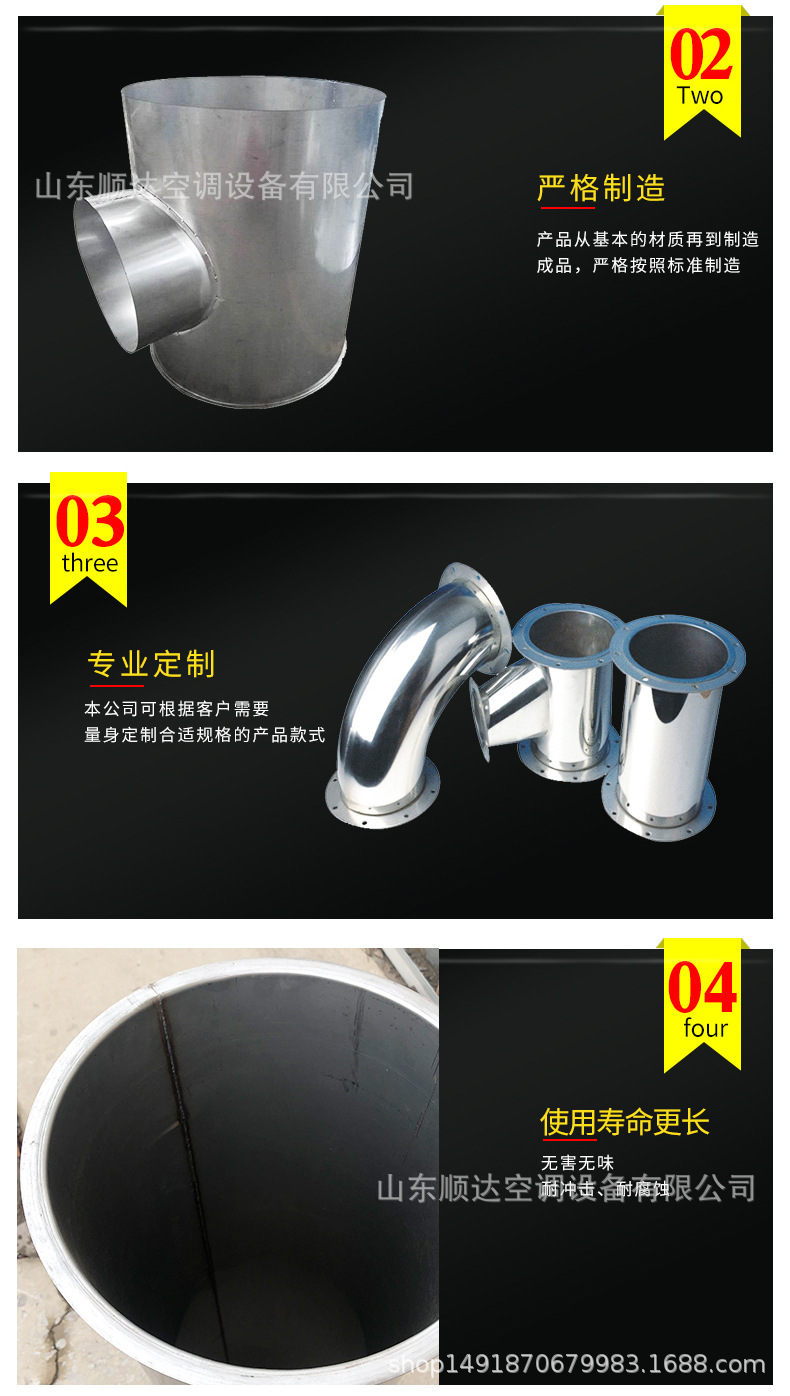 不銹鋼風(fēng)管,不銹鋼風(fēng)管可分為圓形和矩形兩種??筛鶕?jù)工程現(xiàn)場的不同要求,生產(chǎn)各種形狀、各種規(guī)格型號及板材的成品風(fēng)管。不銹鋼風(fēng)管主要材質(zhì)有:SUS304、316、303、310、310S、301、302、304L、316L 、321、201、202、902、904、317、430等。不銹鋼風(fēng)管表面性質(zhì)主要有8K鏡面板、彩色不銹鋼板、不銹鋼磨砂板、不銹鋼拉絲板、不銹鋼花紋板、不銹鋼蝕刻板、鈦金、雪花砂、2B板、BA板和工業(yè) [1] 中厚板。不銹鋼風(fēng)管成品因其優(yōu)異的耐蝕性、耐熱性、高強(qiáng)度等物化性能,主要應(yīng)用于多種氣密性要求較高的工藝排氣系統(tǒng)、溶劑排氣系統(tǒng)、有機(jī)排氣系統(tǒng)、廢氣排氣系統(tǒng)及普通排氣系統(tǒng)室外部分、濕熱排氣系統(tǒng)、排煙除塵系統(tǒng)等。